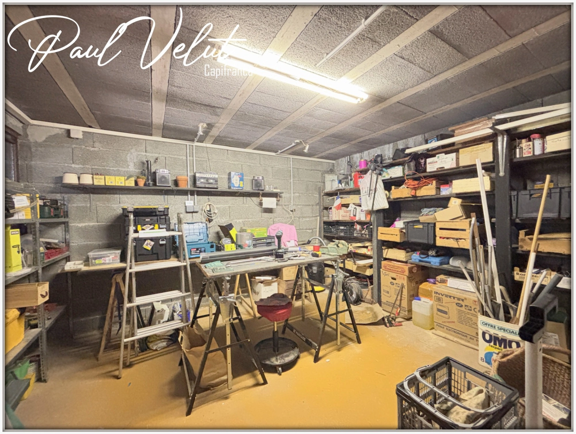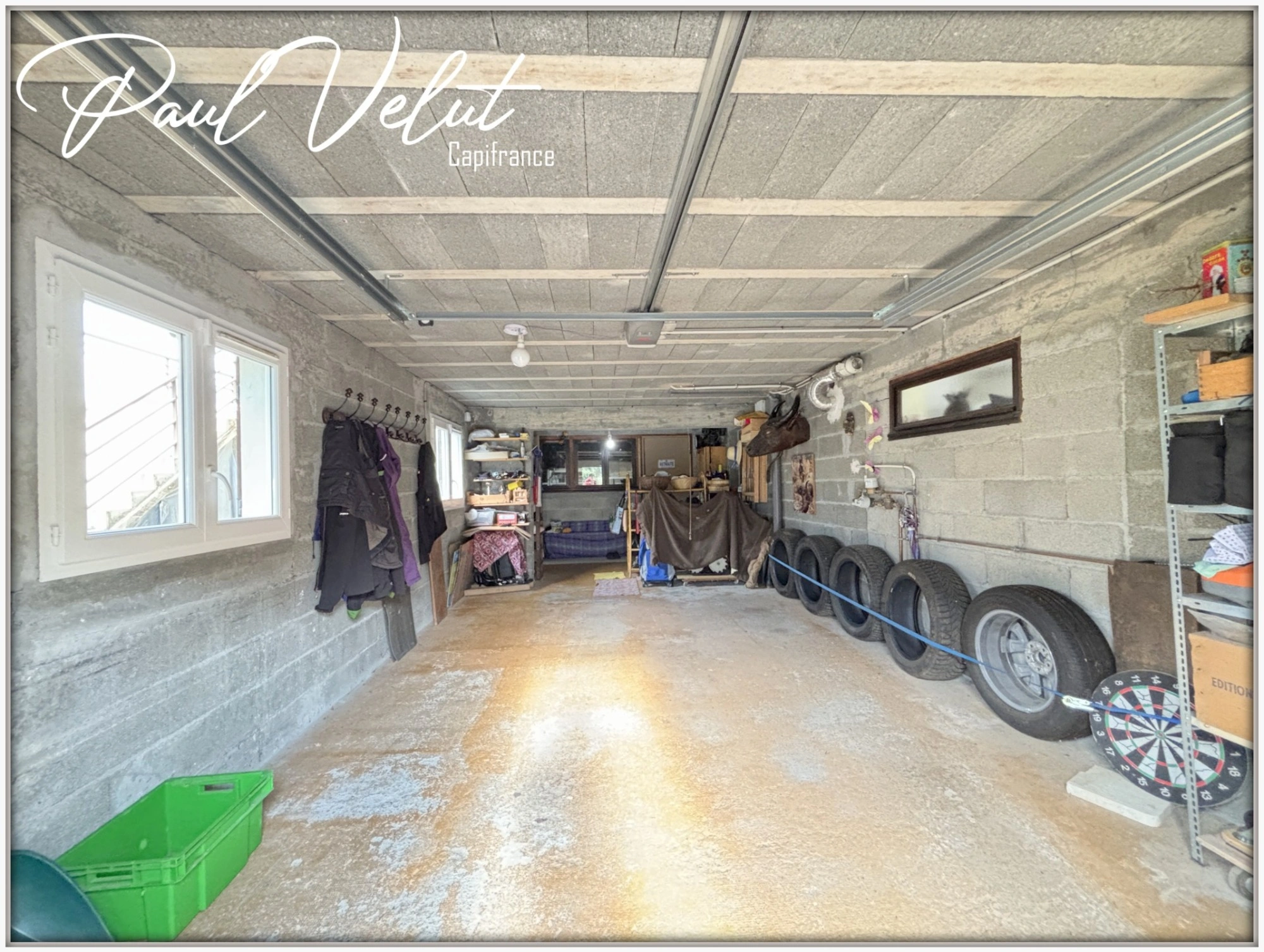 Ground floor: Two garages (15 and 24 m²), a large 47 m² games room to be fitted out according to your wishes (dormitory, gym, studio, etc.), a workshop, a storeroom, a cellar, a shower room with WC and a large laundry room.