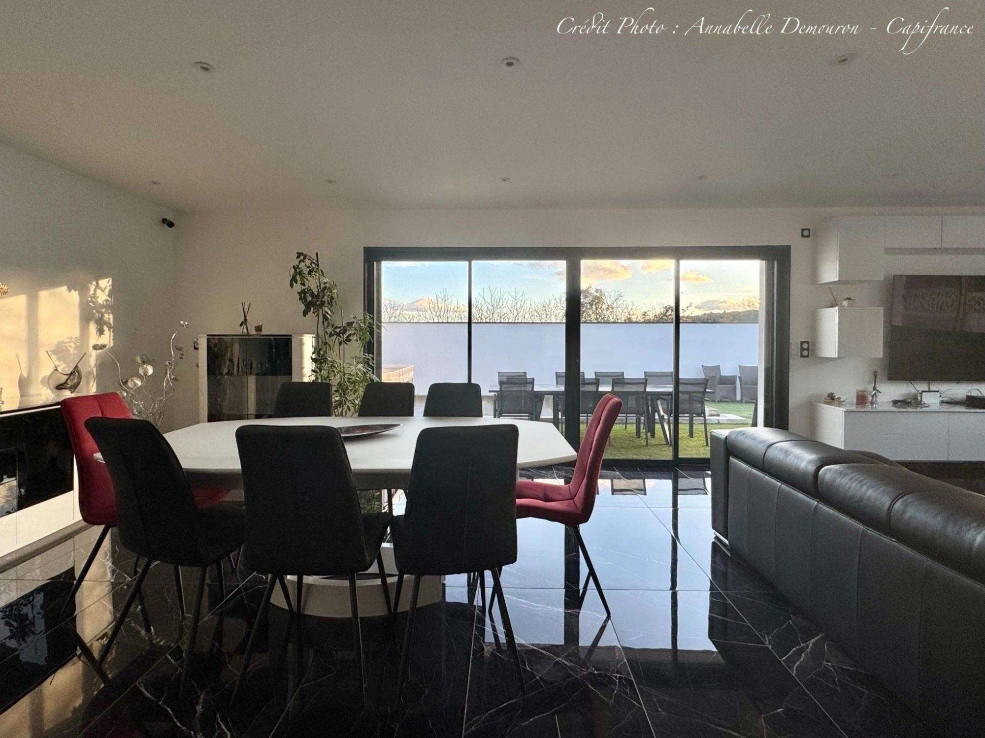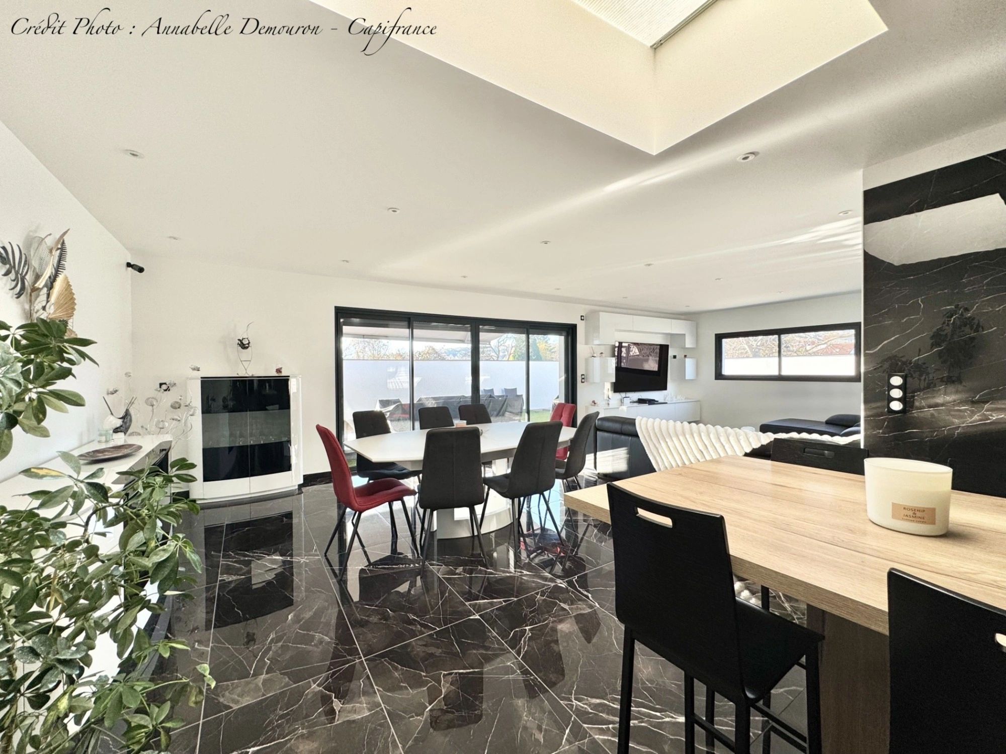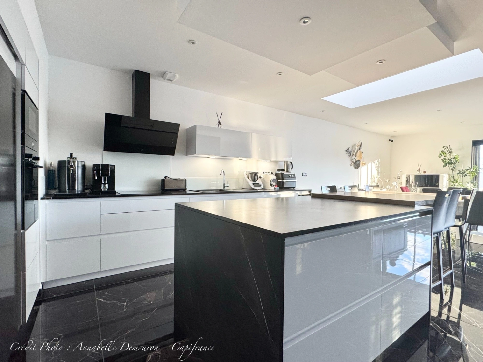 - Une cuisine équipée US moderne avec îlot central déjeunatoire ouvert sur un séjour-salle à manger baigné de lumière, grâce aux grandes baies à galandage qui permettent un accès à la terrasse orientée Sud et Ouest (store banne et portillon sécurisé).