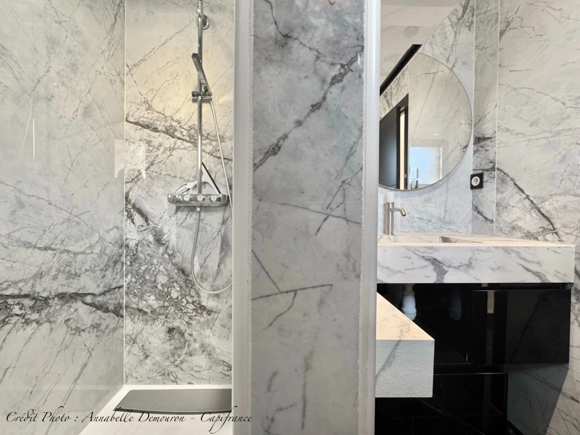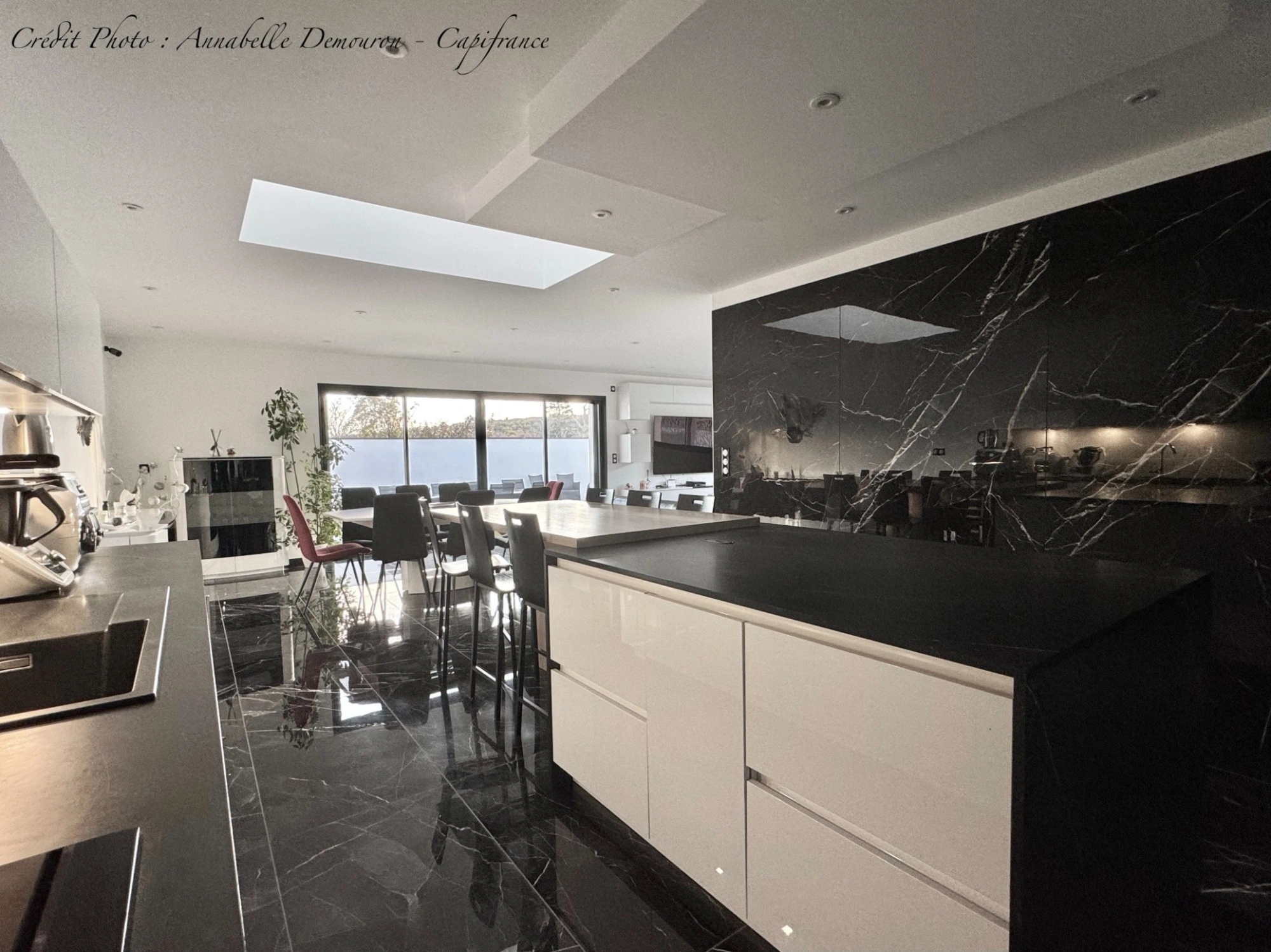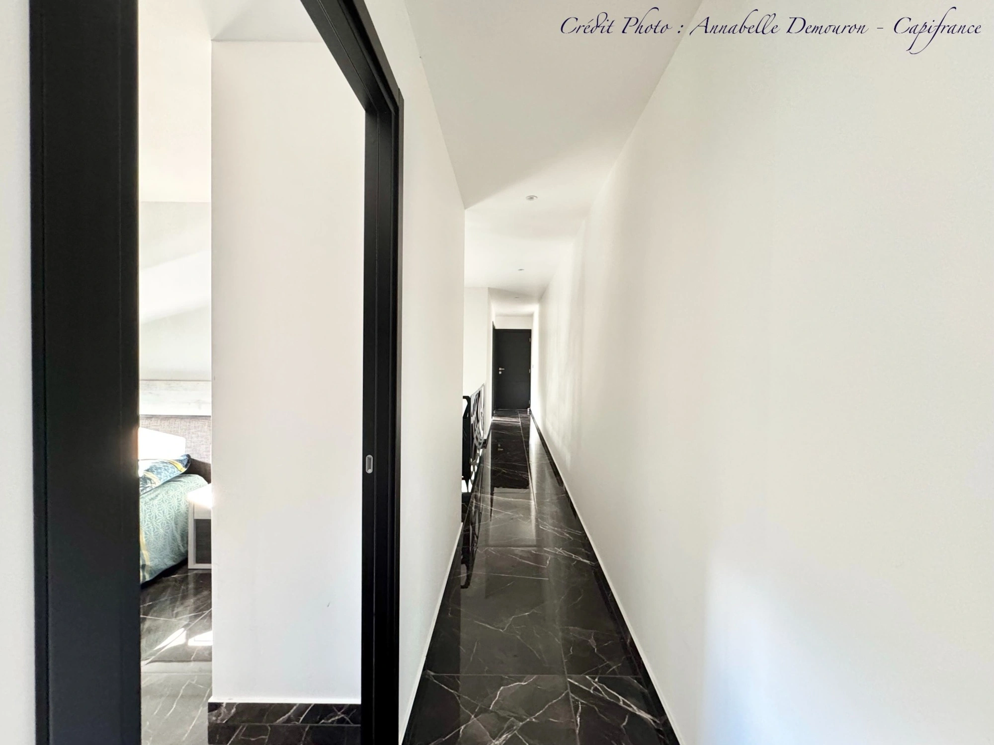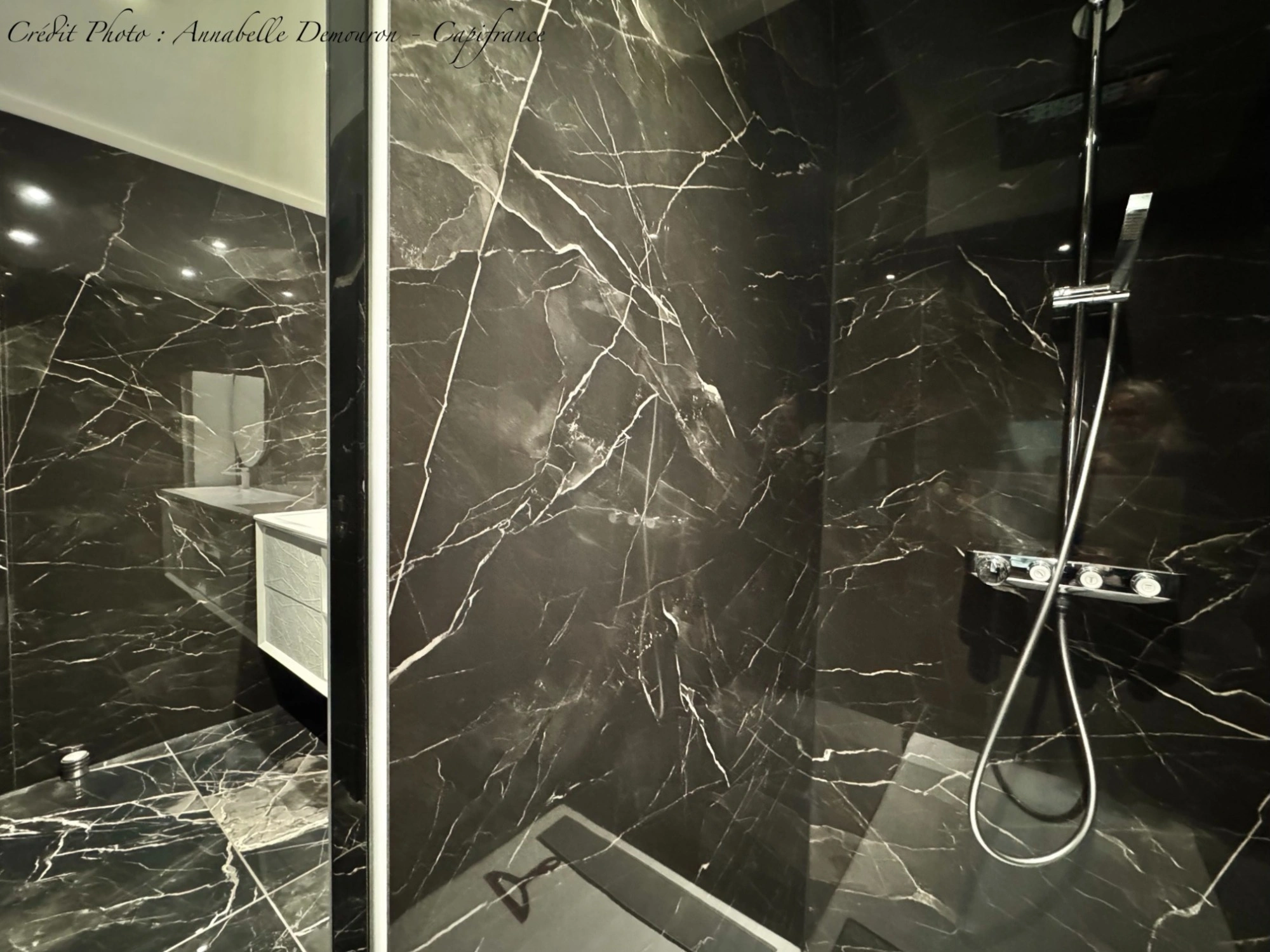 - Carrelage effet marbre noir dans toute la maison,