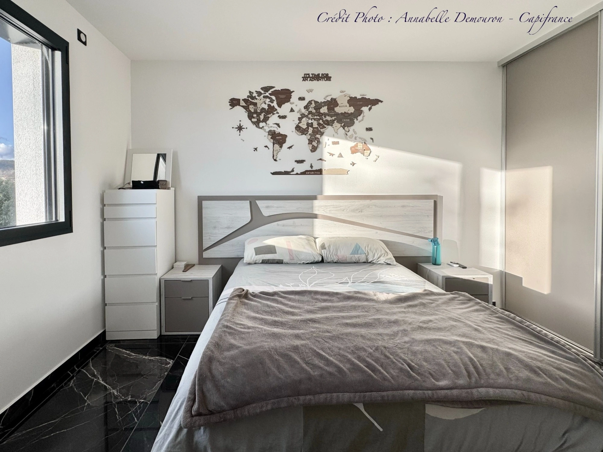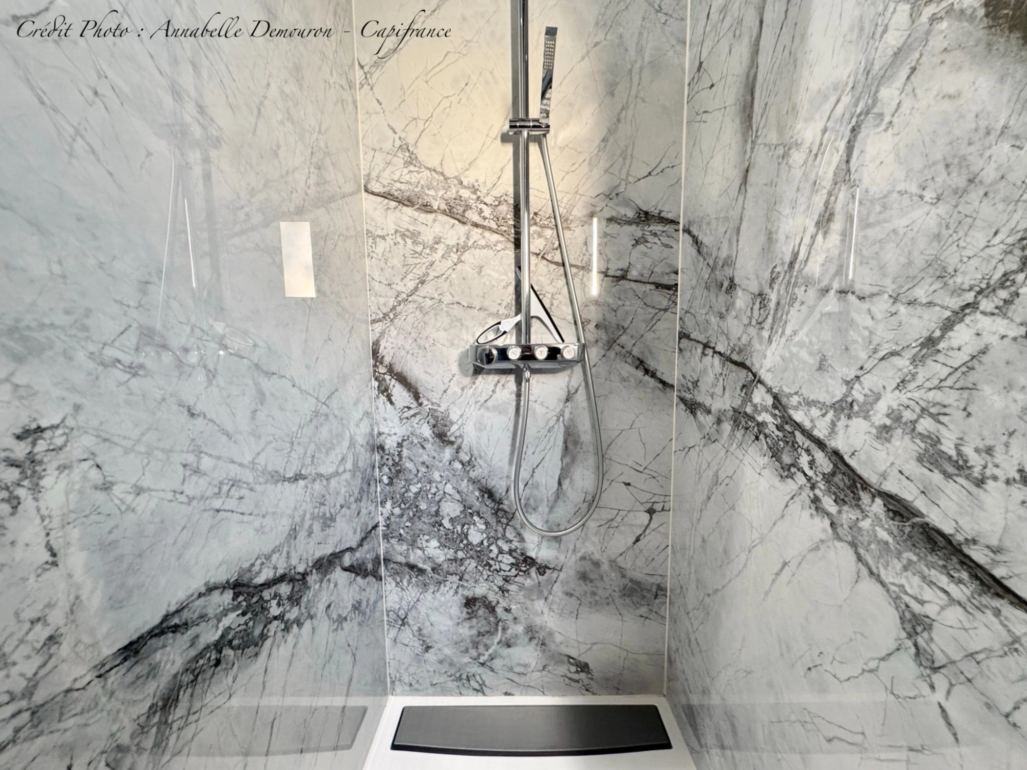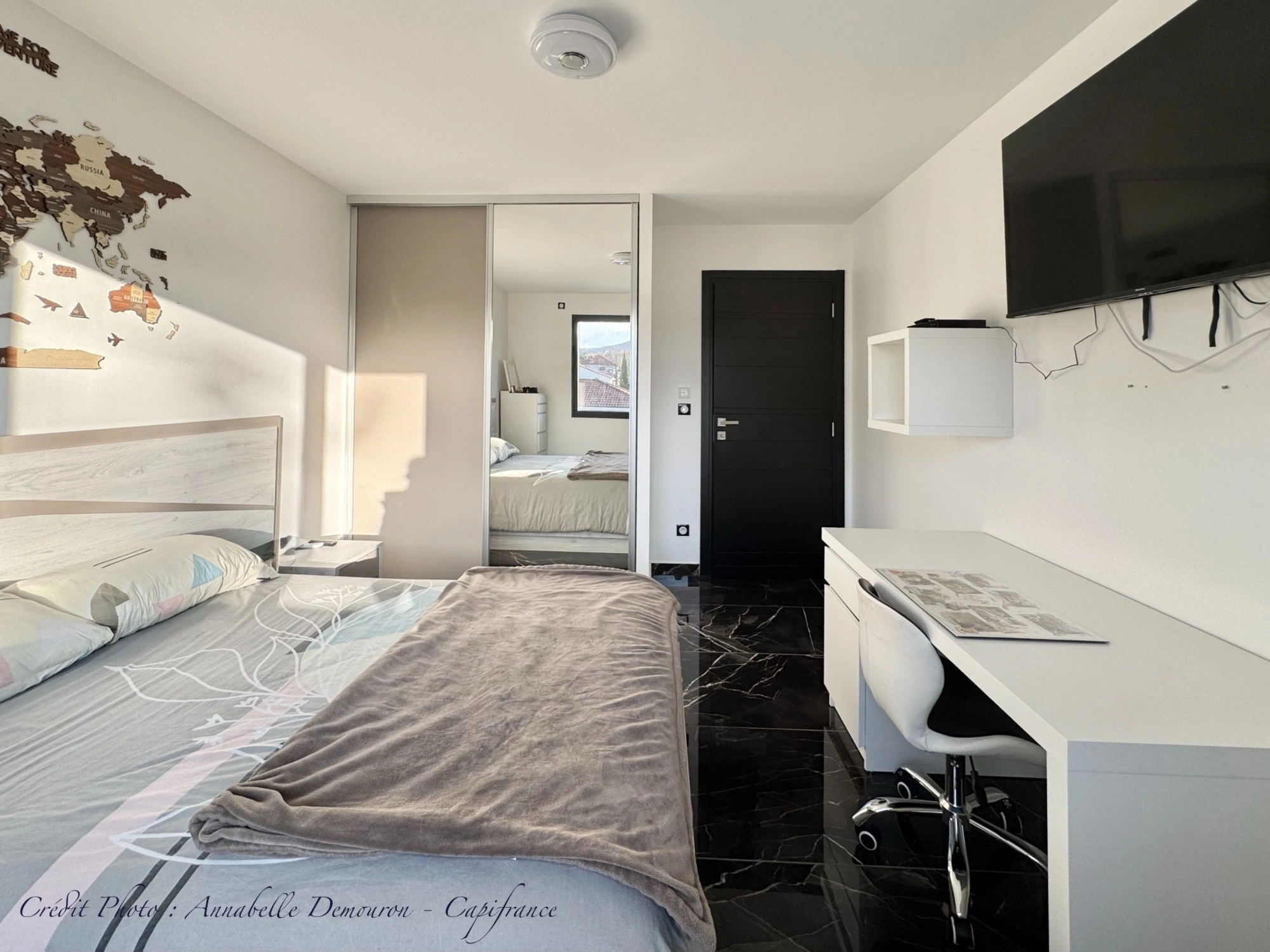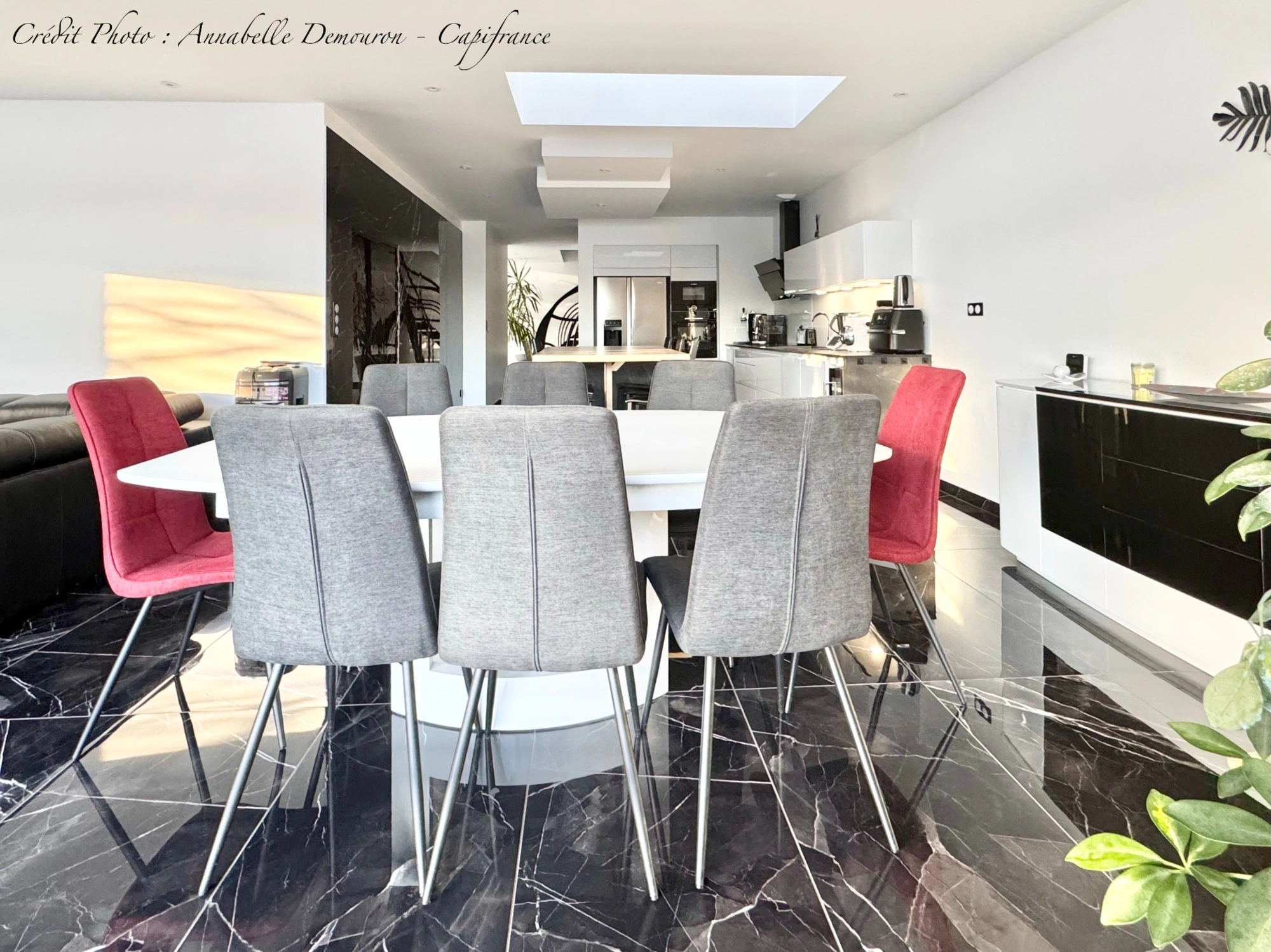 - Carrelage effet marbre noir dans toute la maison,