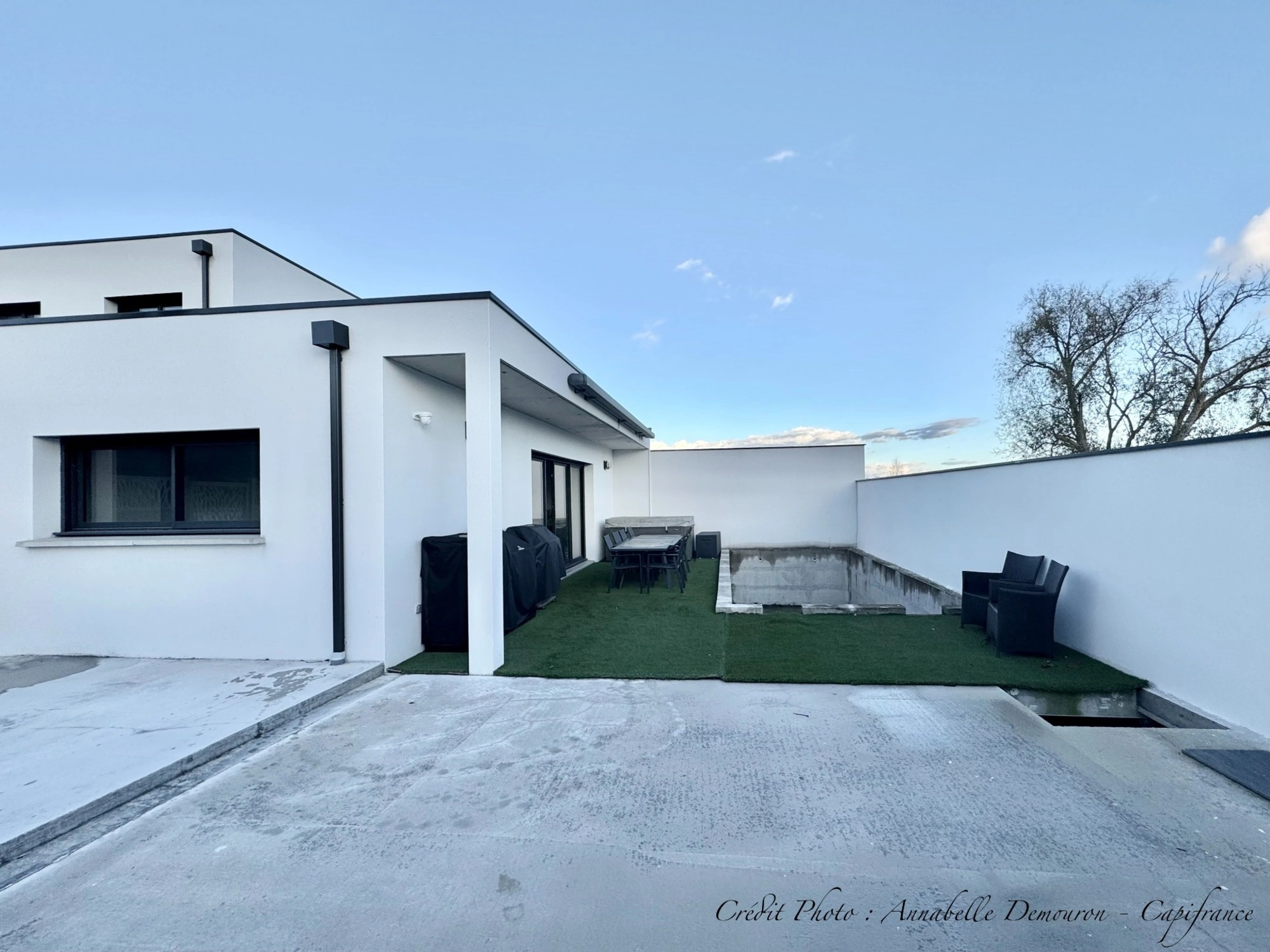 Ici : pas de jardin à entretenir mais à la place, une grande terrasse orientée Sud & Ouest conçue pour devenir un véritable espace bien-être. Les emplacements pour la piscine et le jacuzzi sont déjà creusés: il ne manquera plus que leurs installations pour profiter d’un superbe cocon extérieur.