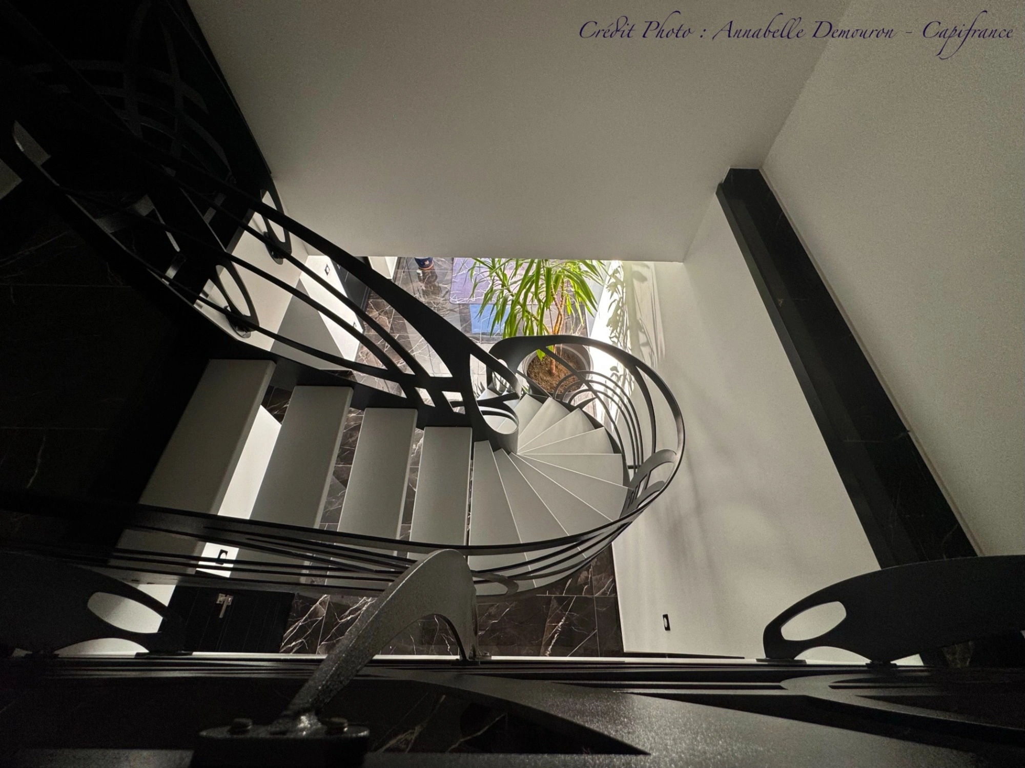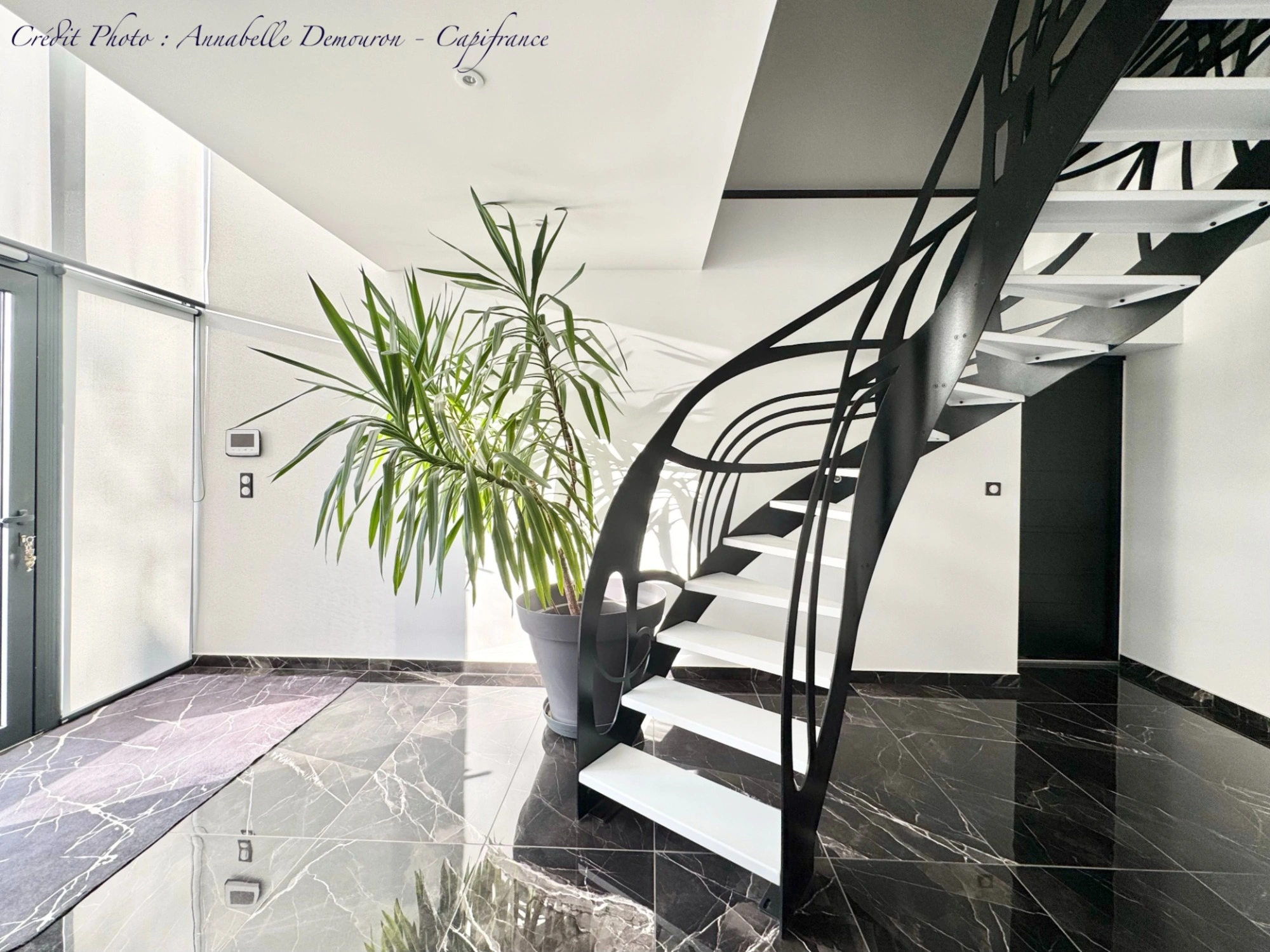 Dès l’entrée, le ton est donné: un escalier métallique sculptural attire le regard et structure l’espace.