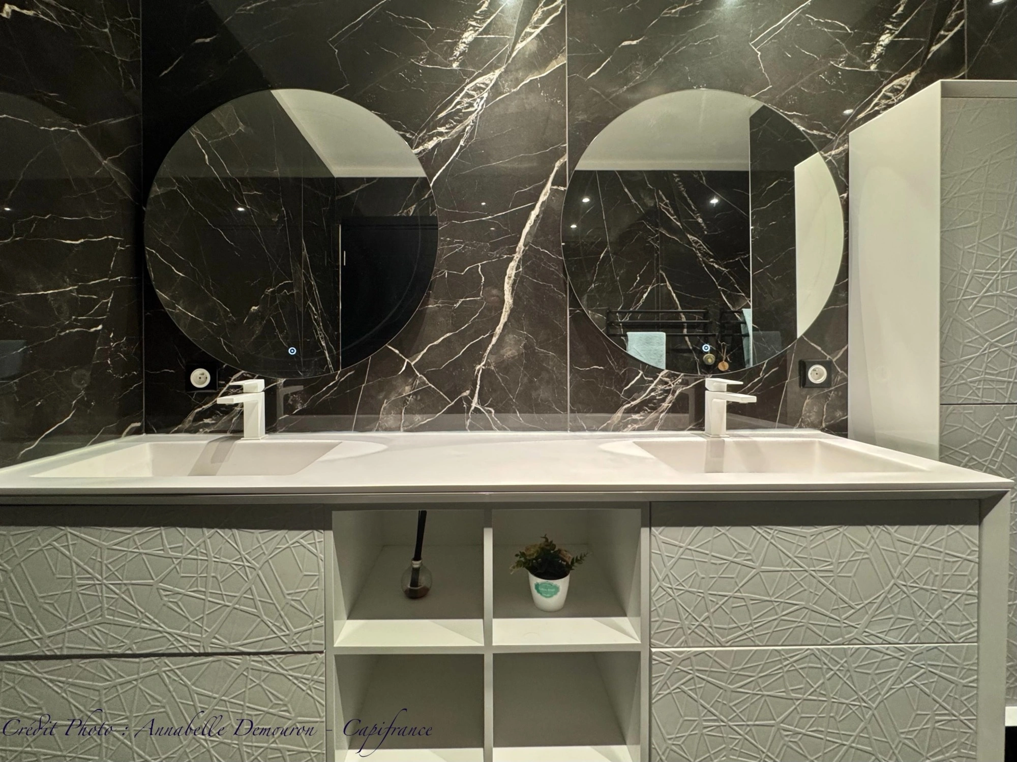 - Une salle d’eau avec grande douche à l’italienne et meuble double vasque,