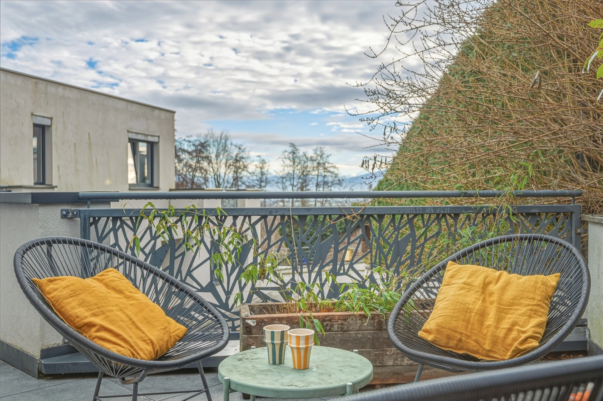 La maison se distingue par ses espaces extérieurs d’exception : elle dispose de deux très grandes terrasses, offrant de somptueuses vues dégagées sur la nature et le Mont-Blanc, tout en préservant une parfaite intimité.
