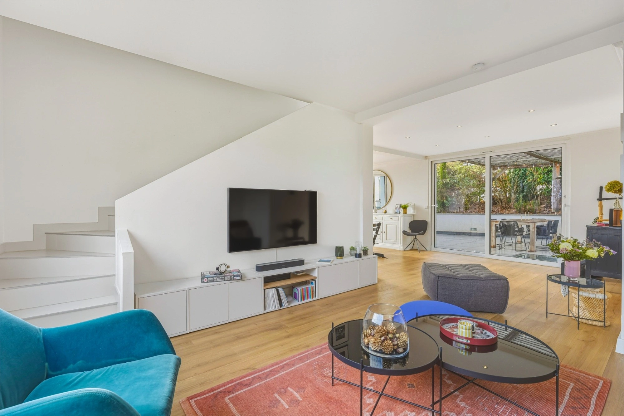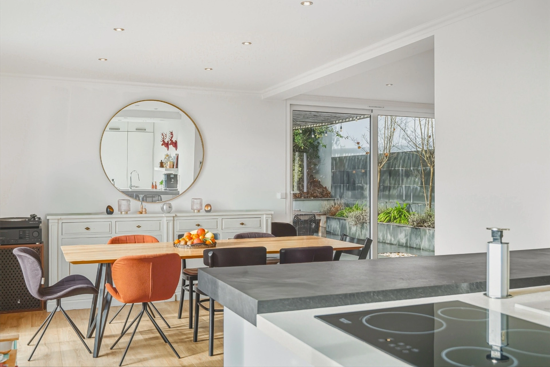 Développant une surface totale d’environ 165 m², la maison présente une distribution harmonieuse et des volumes parfaitement étudiés. Le vaste espace de vie, largement ouvert sur l’extérieur, constitue le cœur de la maison.
