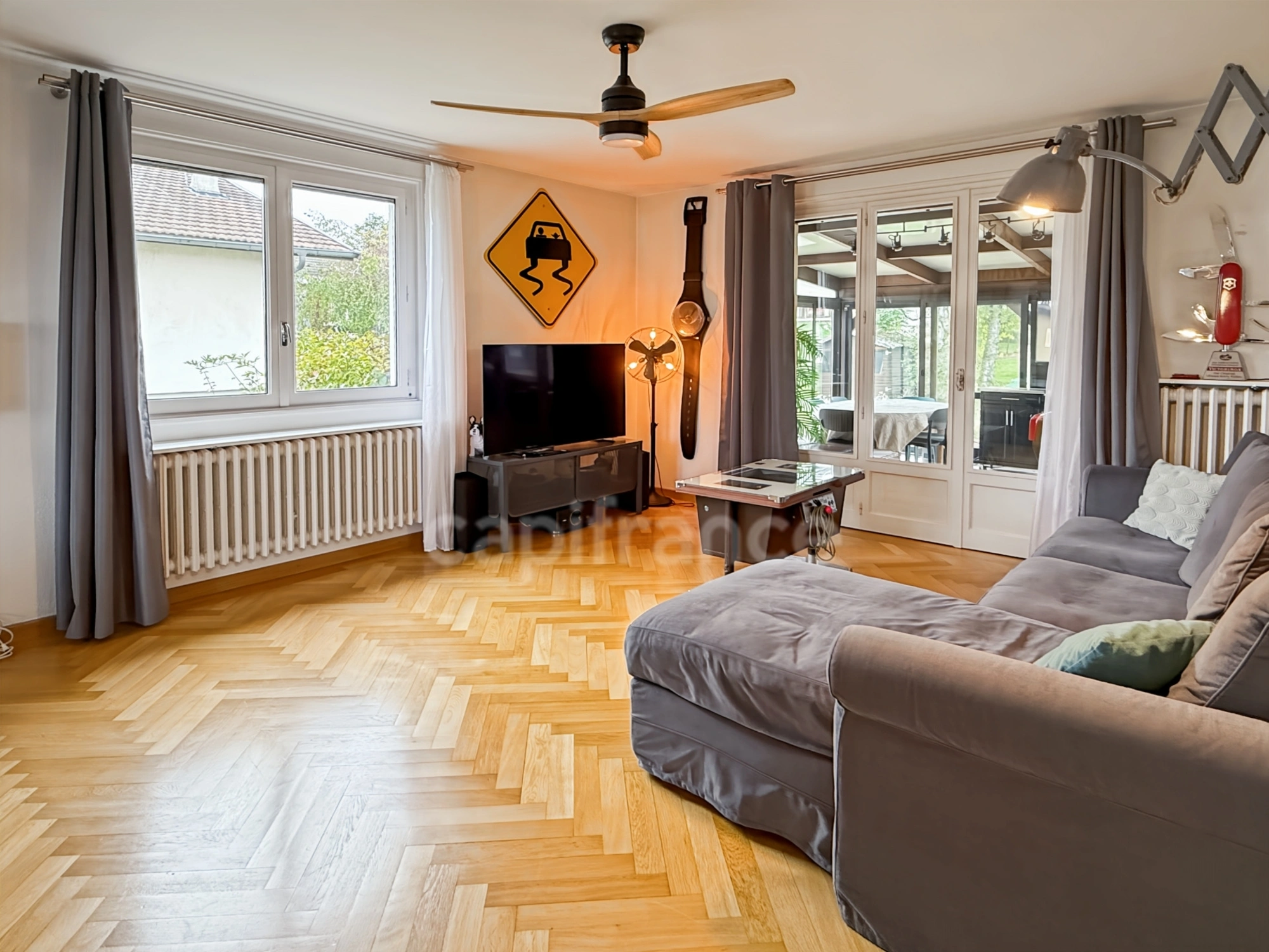 Prévessin-Moens - EXCLUSIVE - 112 sq m house situated on a magnificent 970 sq m plot, a rare find in this area. Facing southwest with views of the Jura mountains, the unfenced garden offers excellent potential for landscaping and the possibility of extending the living space up to 136 sq m. TPG bus service (lines 60, 64, and 66) is 350 meters away, providing direct access to the airport, Cornavin train station, and Geneva city center. The garden level features: - a double living room open to the kitchen - southwest exposure with breathtaking views of Mont Blanc - triple exposure, very bright - a 17 sq m veranda opening onto the garden. All rooms benefit from unobstructed views of Mont Blanc or the Jura mountains. The sleeping area comprises: 3 bedrooms, a bathroom with a window, and a separate WC. On the ground floor: a large family room, a laundry room, a pantry and a 36m2 garage. The house is habitable as is, offering numerous possibilities for modernization or extension in a quiet and sought-after environment.