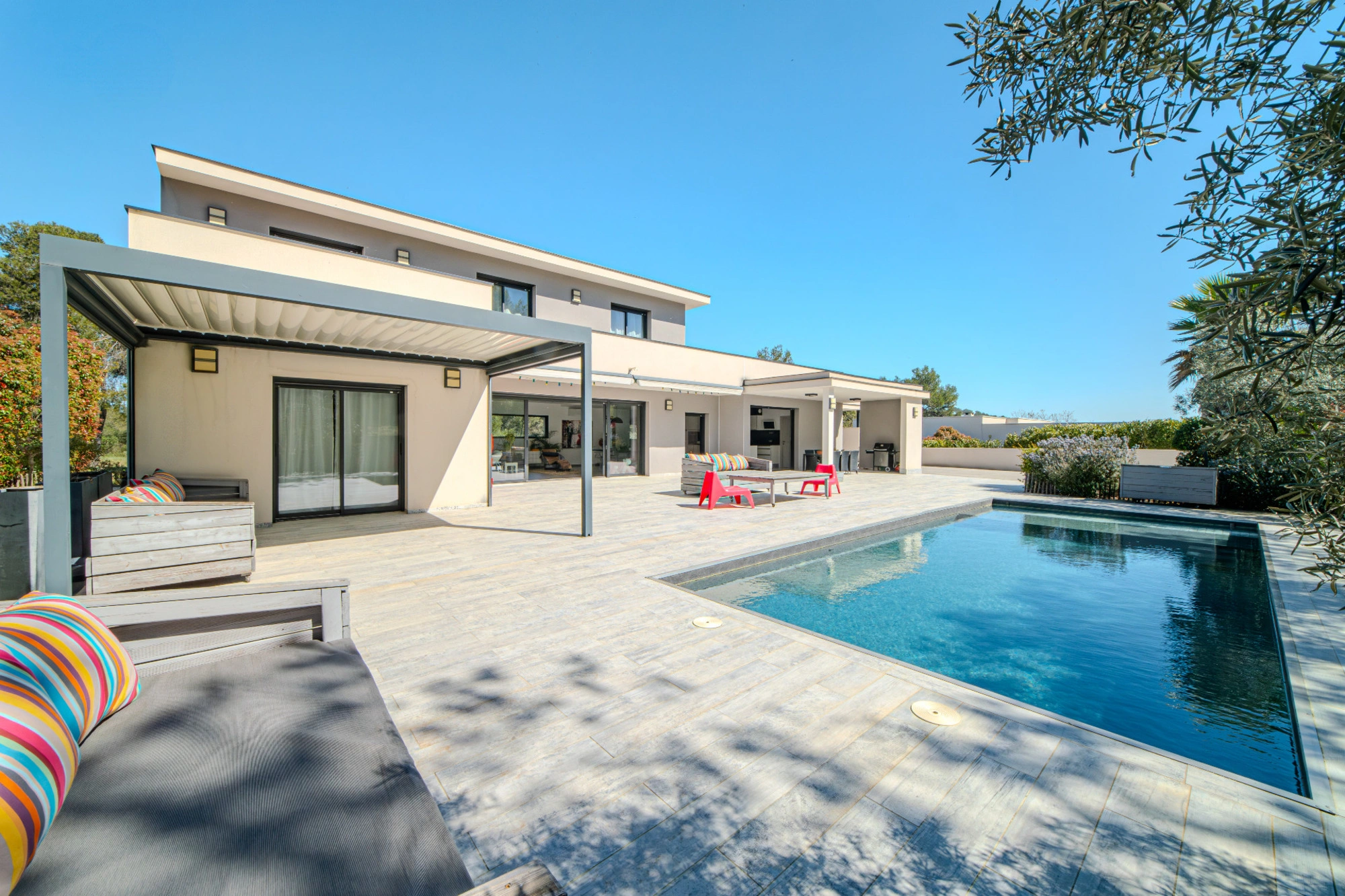 Nichée dans un écrin de verdure à l'abri des regards et érigée sur un terrain paysagé de 1500 m², elle offre des prestations haut de gamme.