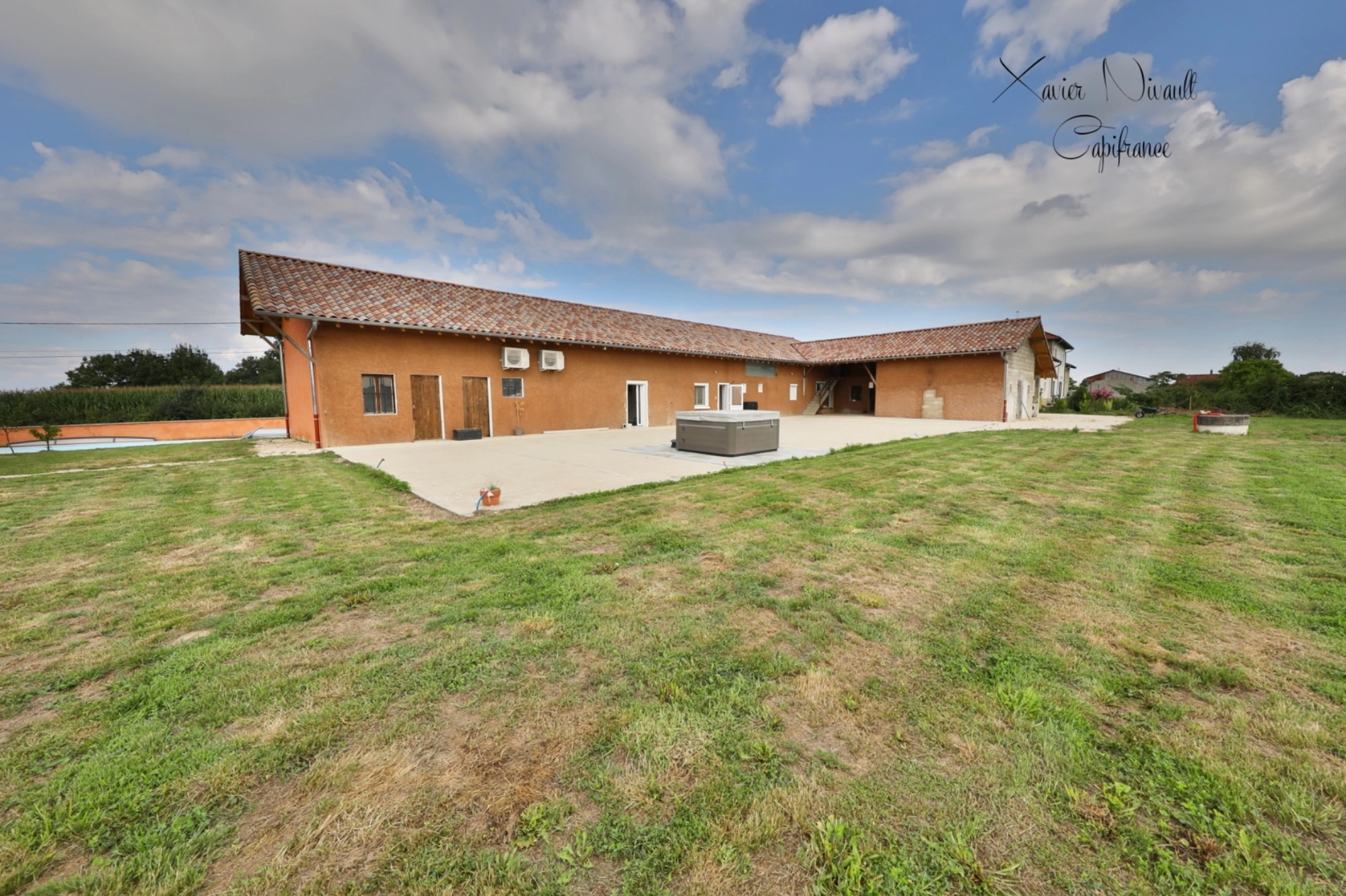 A l'extérieur, vous profitez d'un cadre paisible avec une vaste terrasse de près de 300m2 (carrelage finalisé pour la vente), Terrain de pétanque...