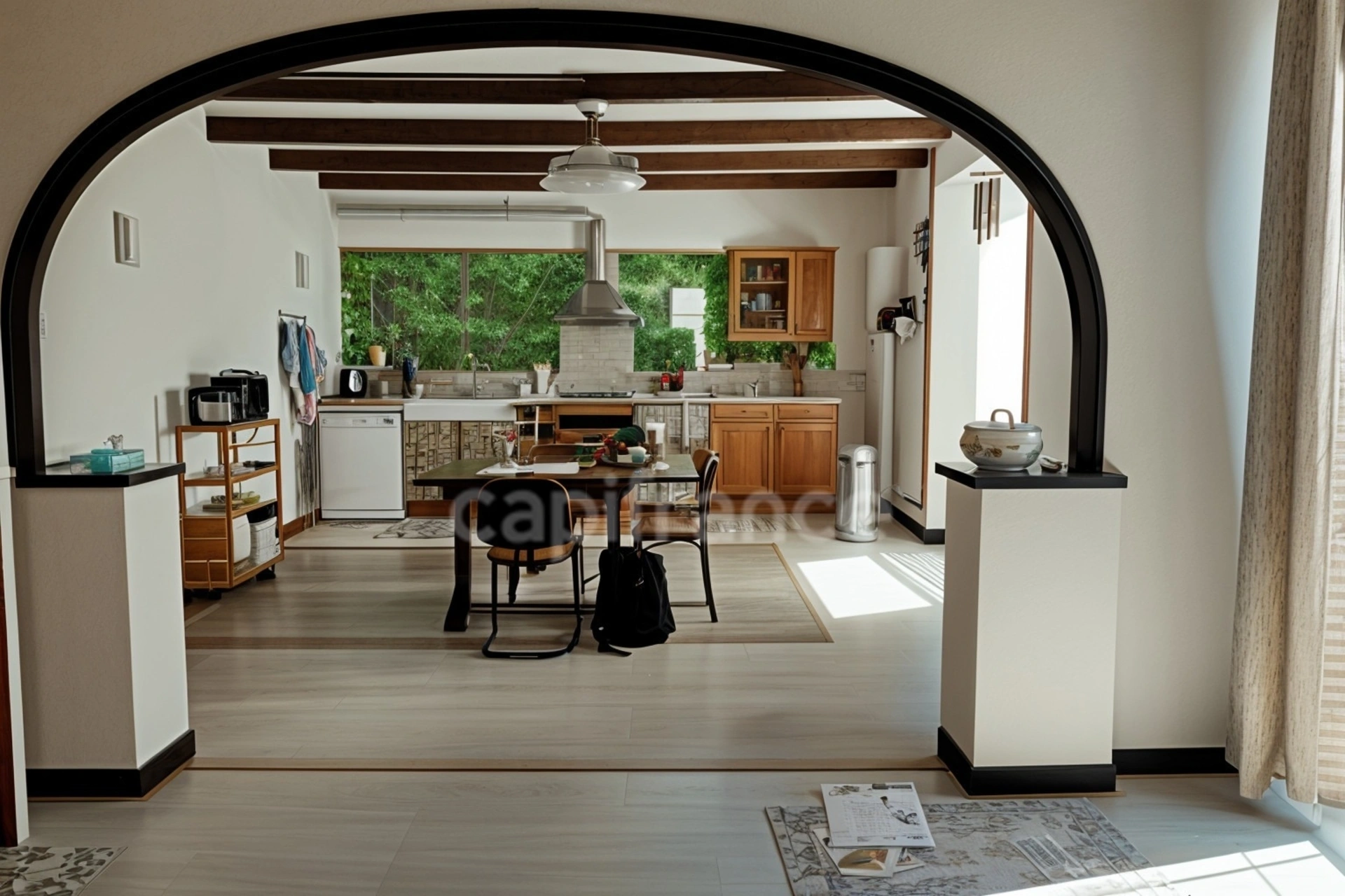 Salon/Séjour : Vaste espace lumineux avec une cuisine ouverte, idéal pour vos moments en famille ou entre amis autour du bar ou du cantou