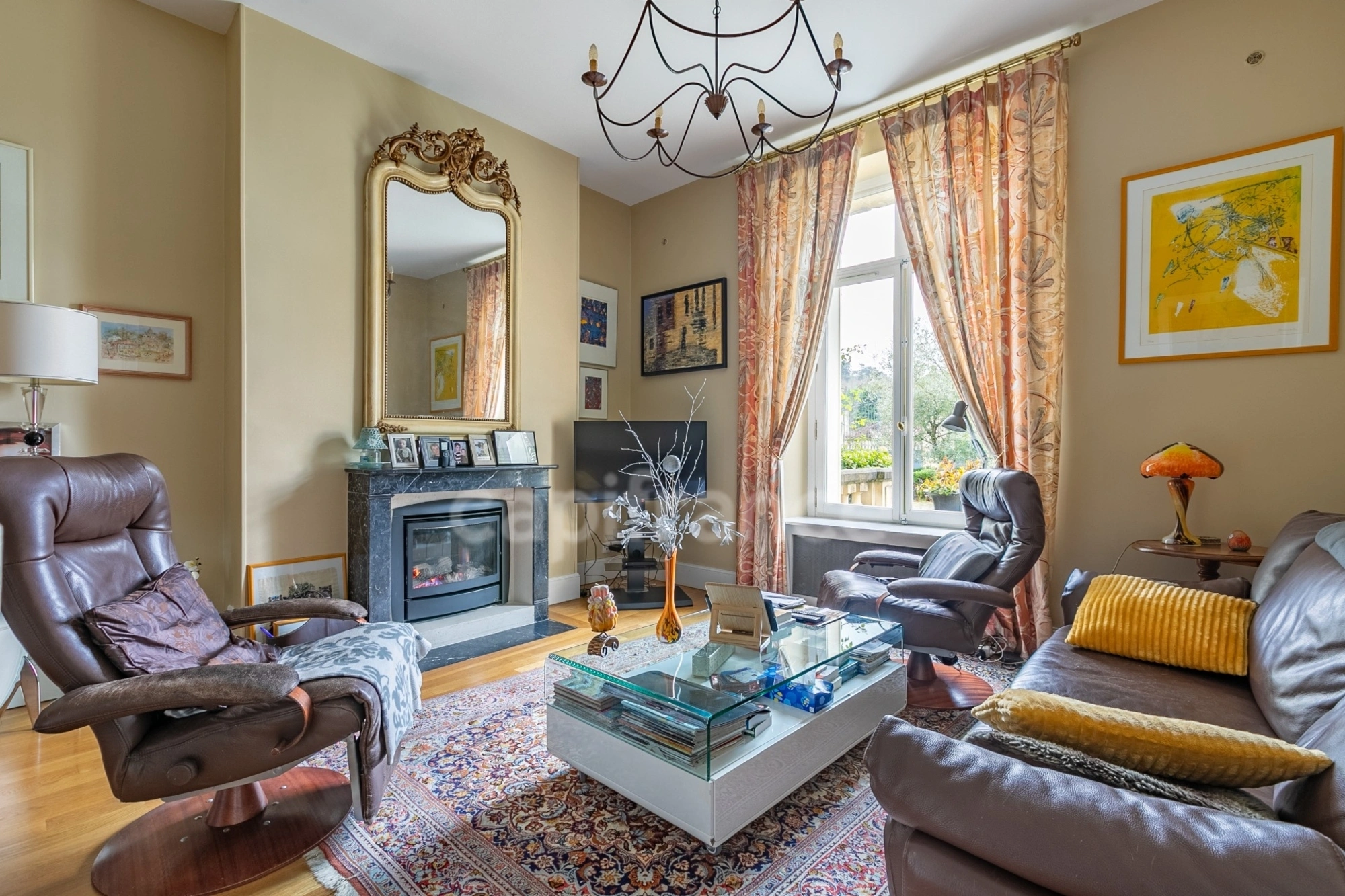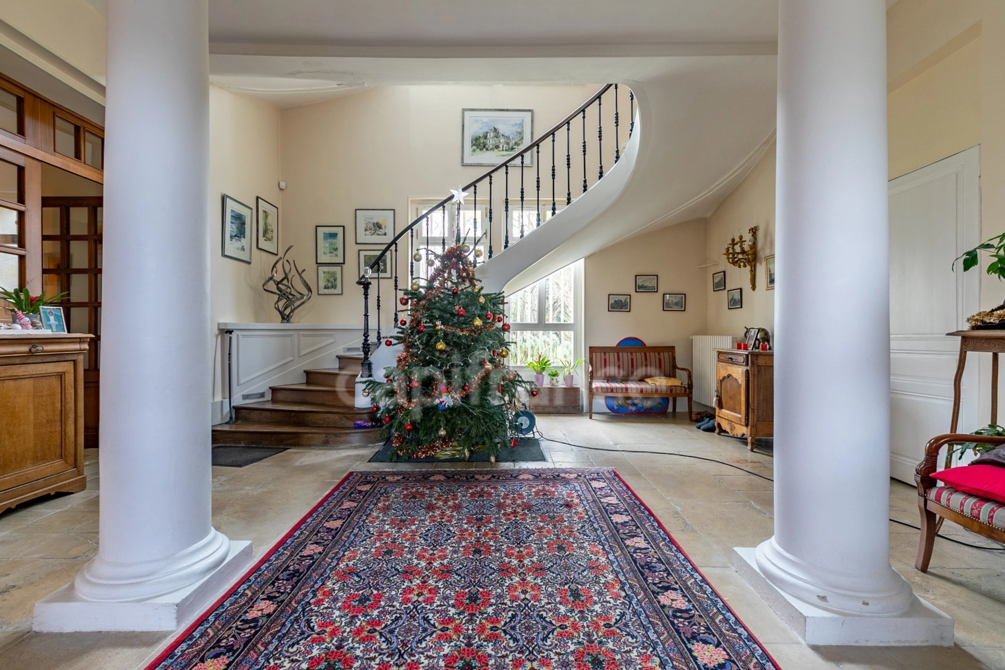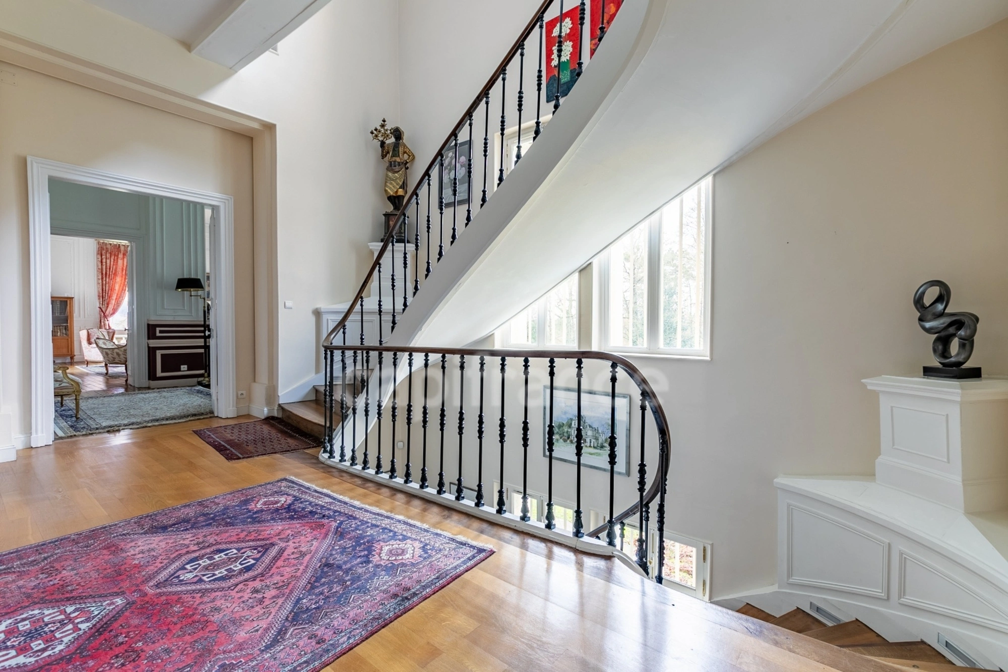 Elle dispose d'une grande salle de réception, d'un salon exécutif et autres petits salons, d'une grande cuisine équipée, d'un bureau, de 6 à 7 chambres, de 4 salles de bains et douche à l'italienne, de vrai parquet en chêne, des cheminées, des moulures et des hauts plafonds.